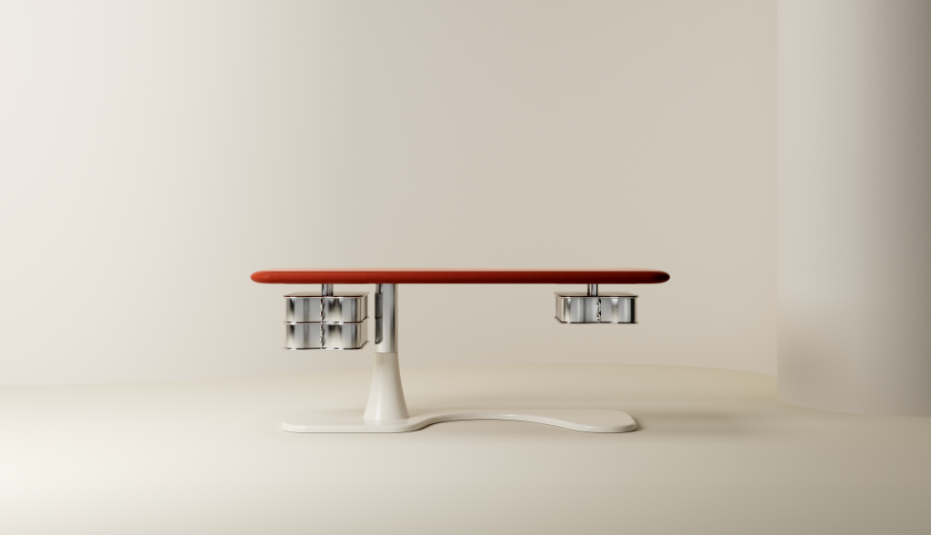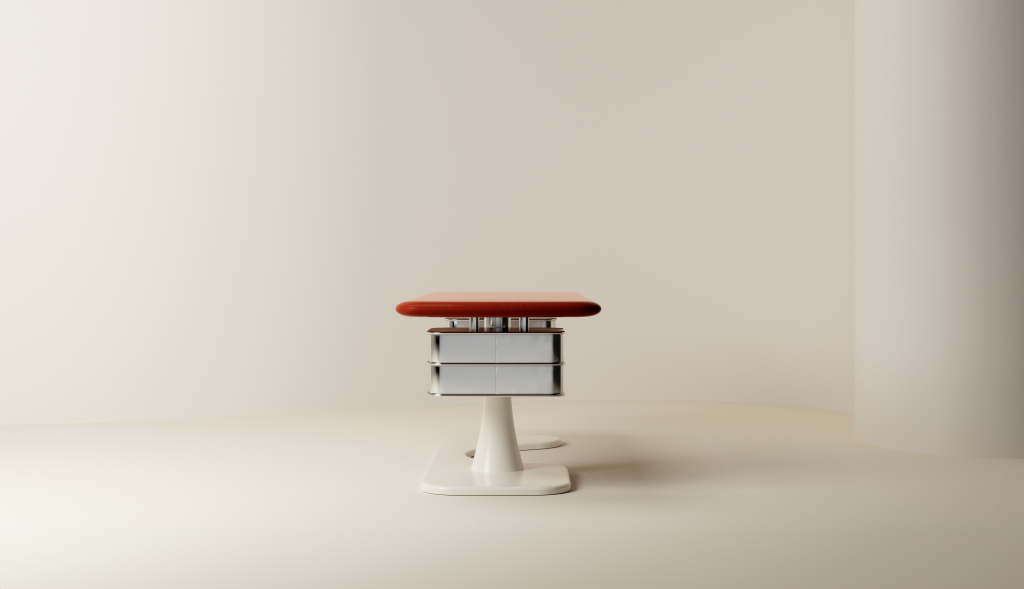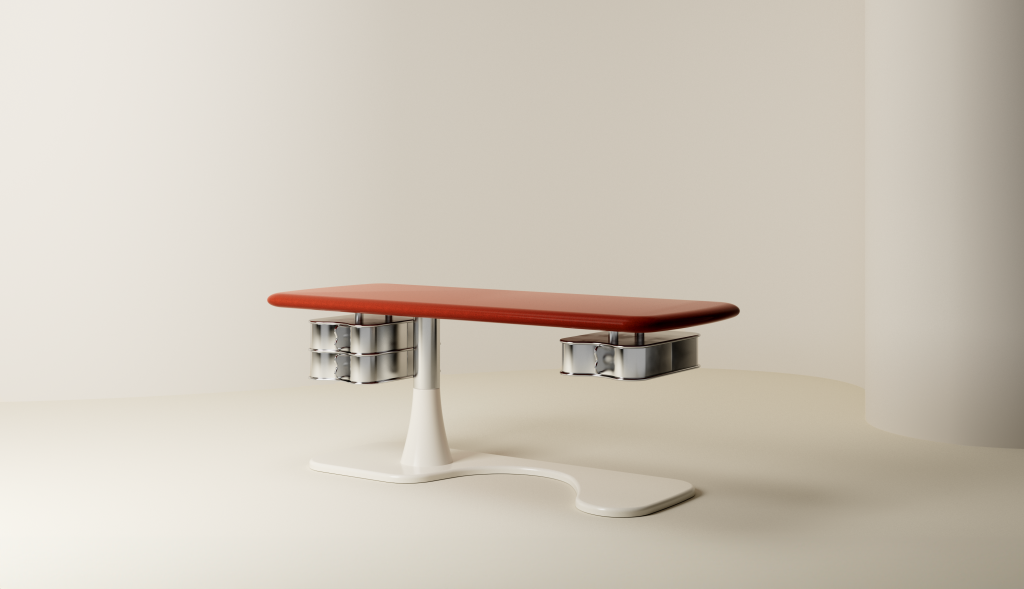 CANTILEVERED ALUMINIUM DESK WITH LEATHER TABLETOP AND LINED INSERTS.