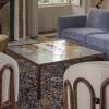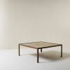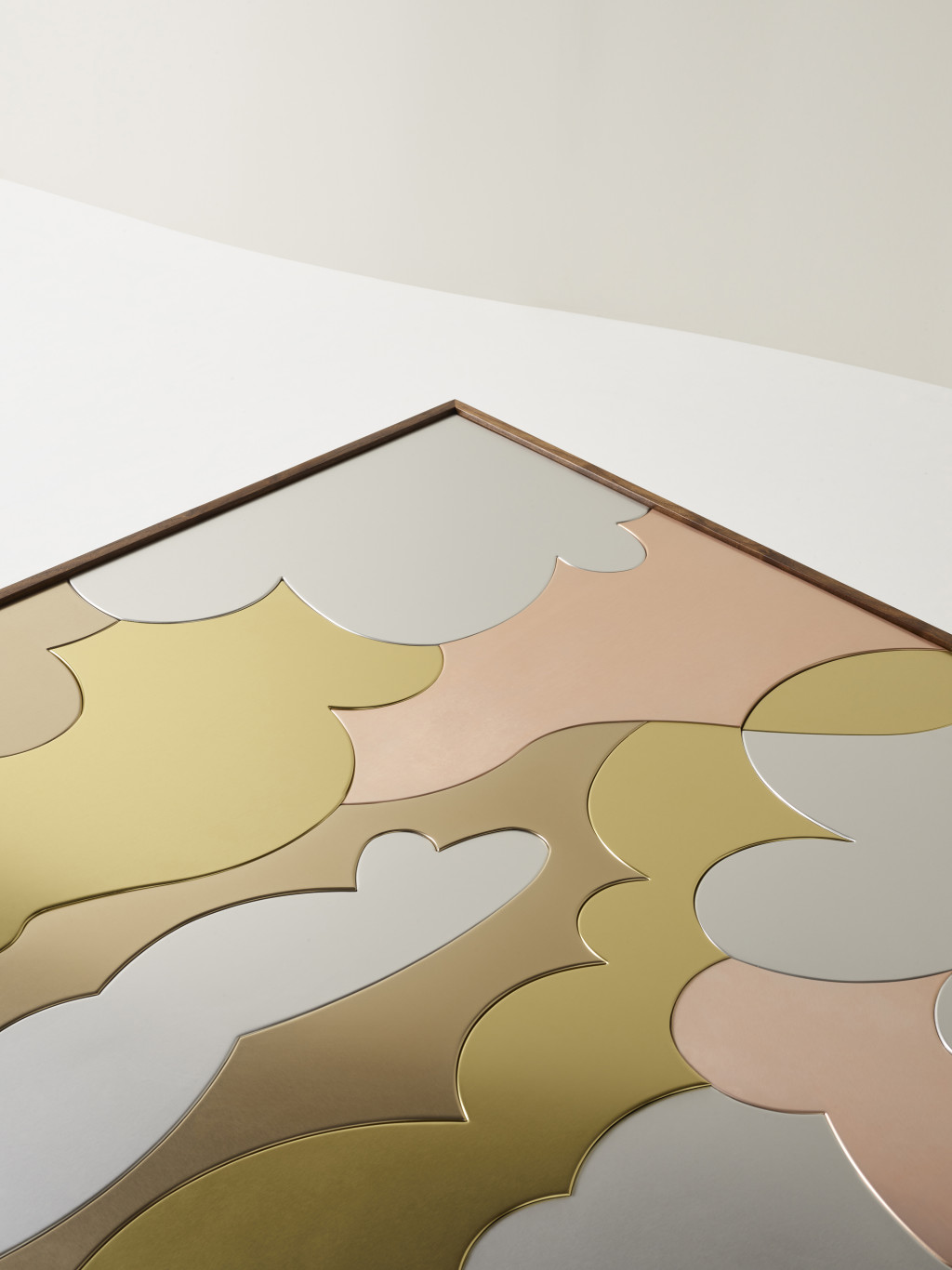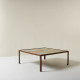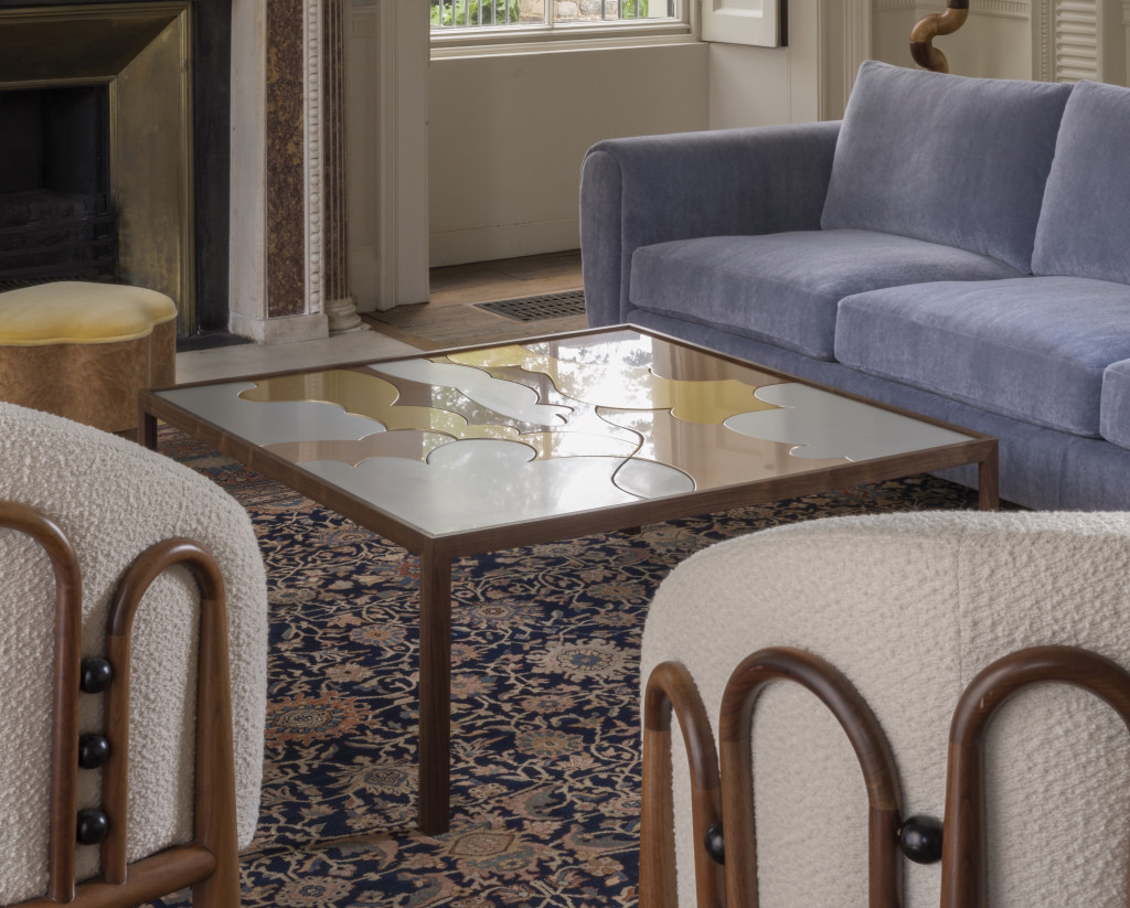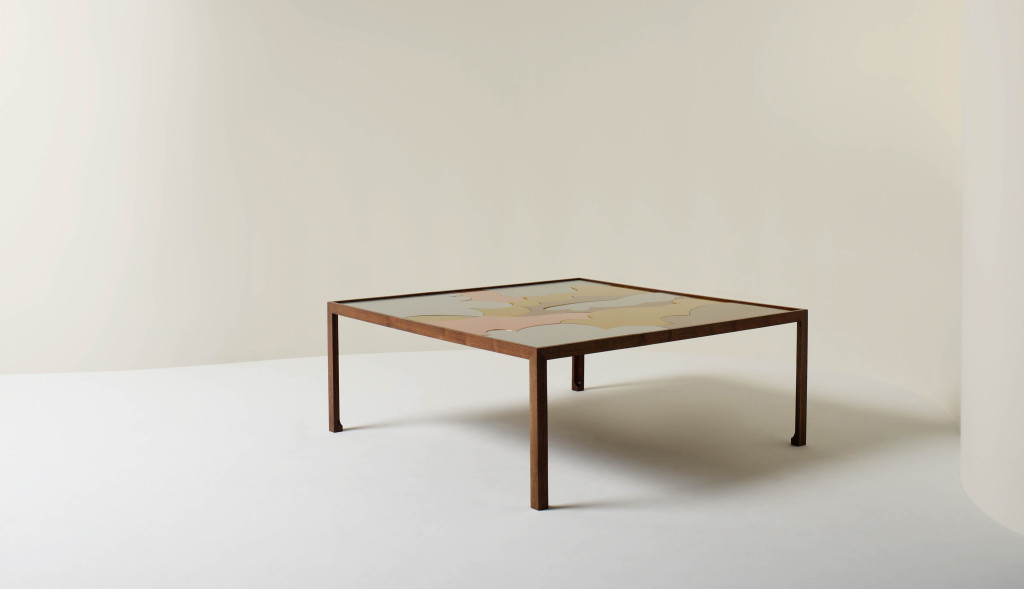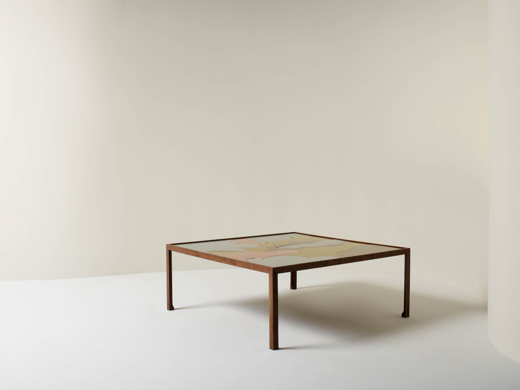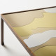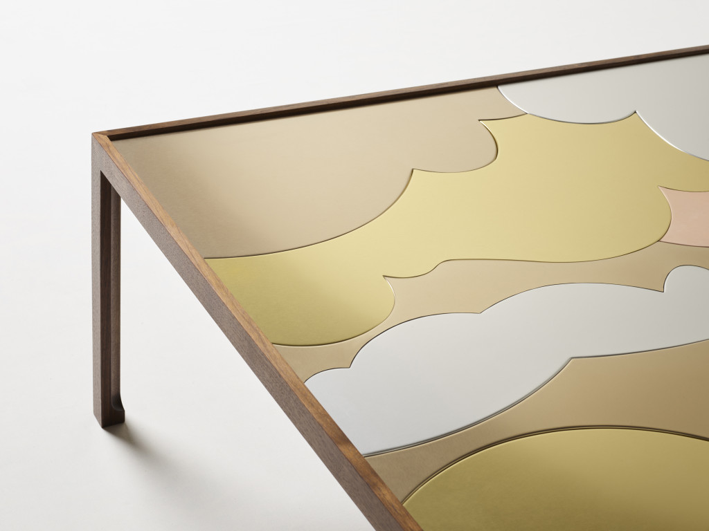 EUROPEAN WALNUT COFFEE TABLE WITH ANODISED ALUMINIUM TILES.