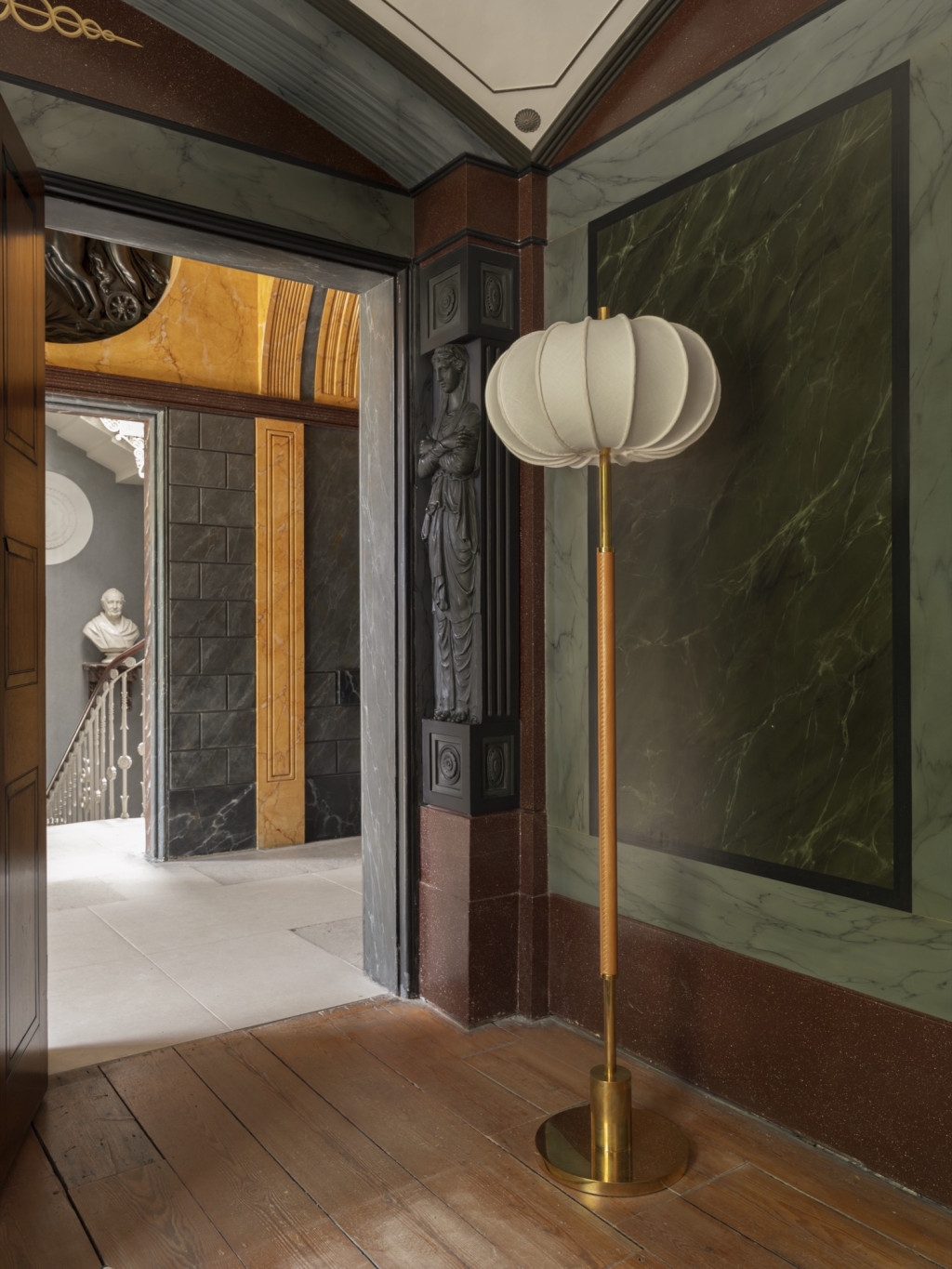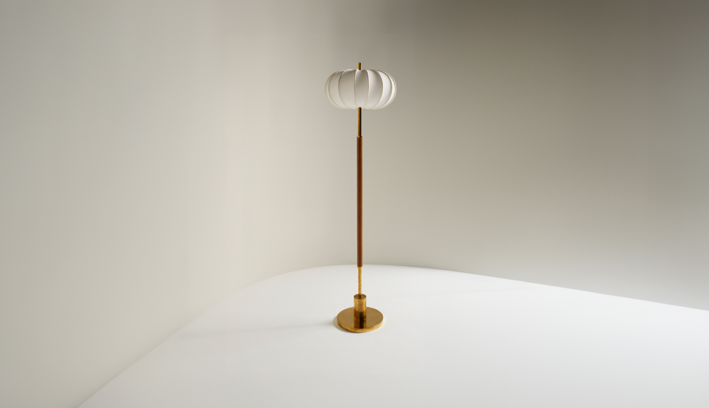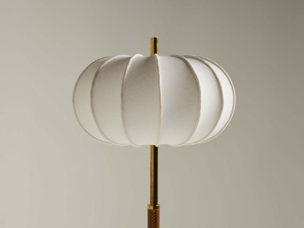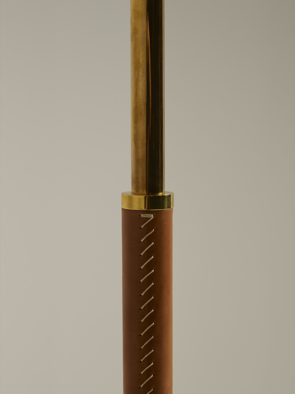 THE LEATHER-WRAPPED BRASS FLOOR LIGHT WITH A SILK LINEN SHADE WITH HAND-STITCHED TRIM.