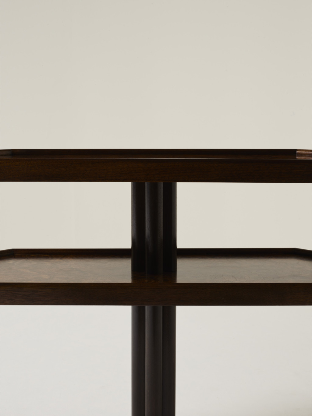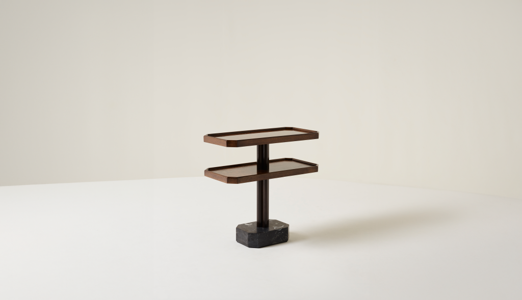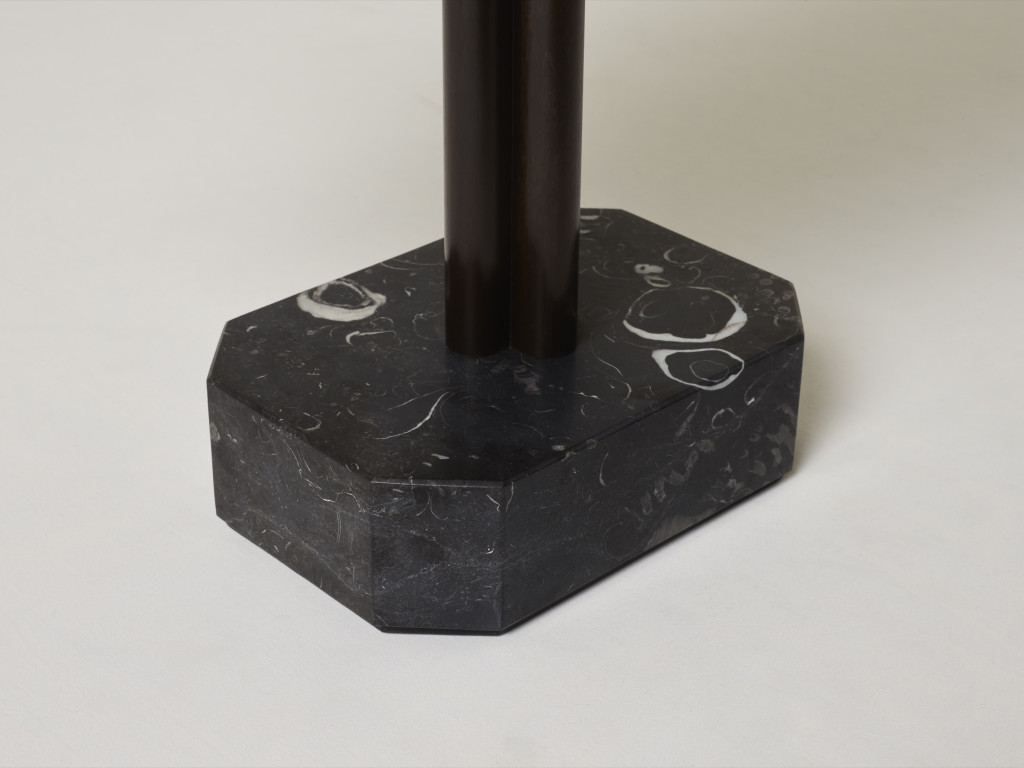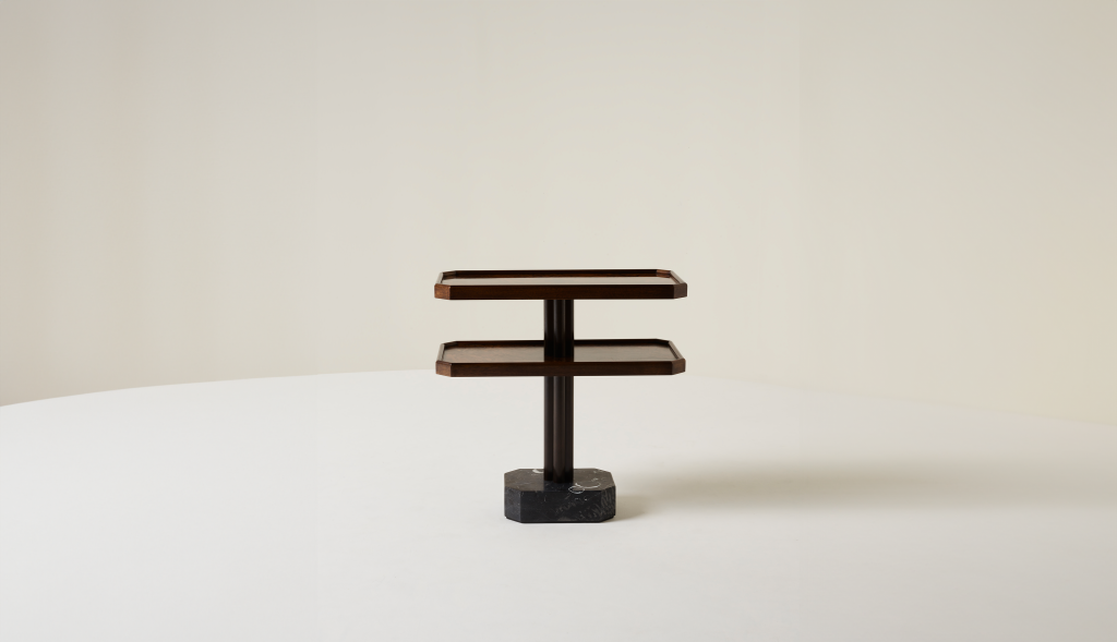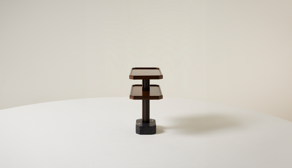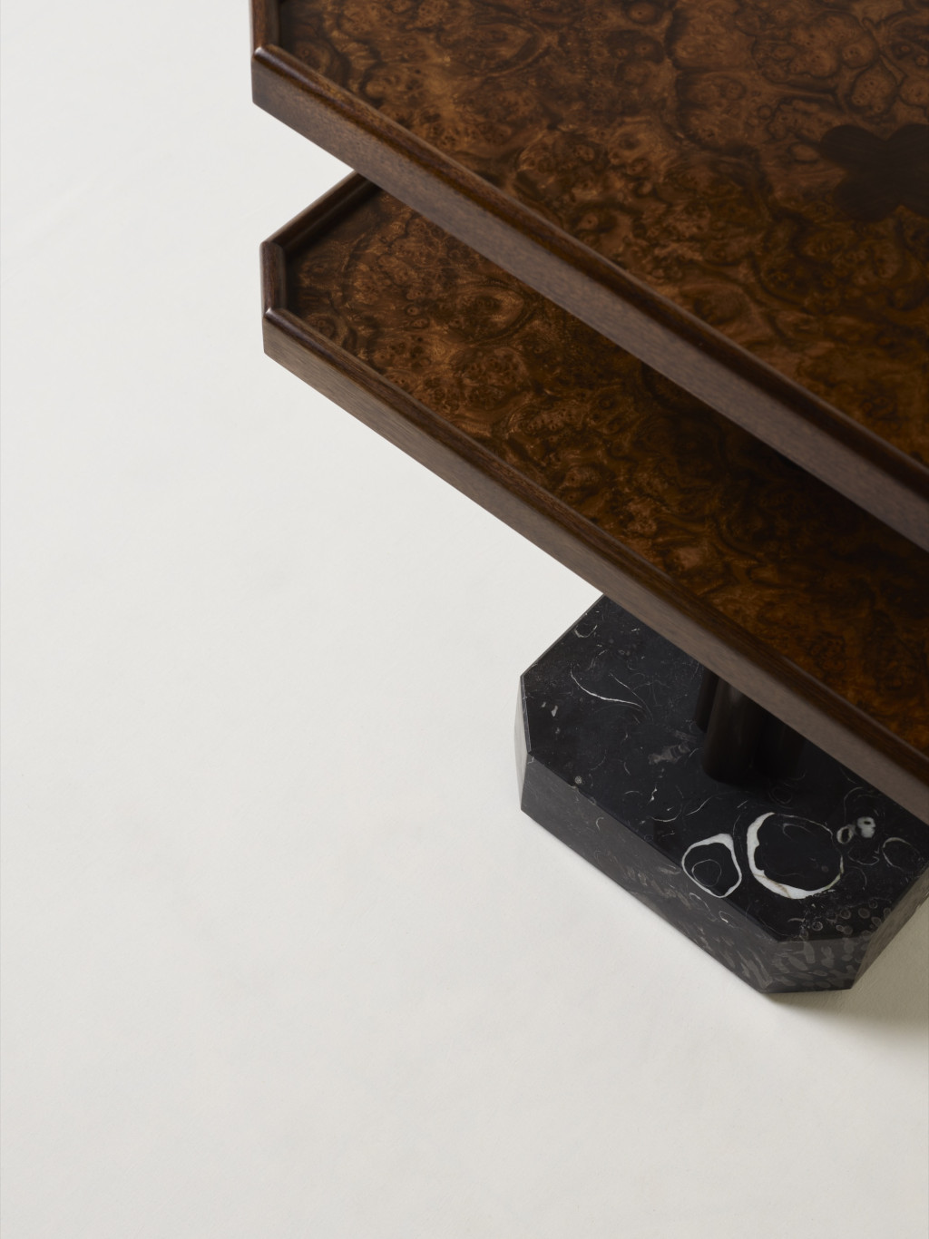 WALNUT BURR AND SOLID AMERICAN WALNUT SIDE TABLE WITH KILKENNY LIMESTONE BASE.