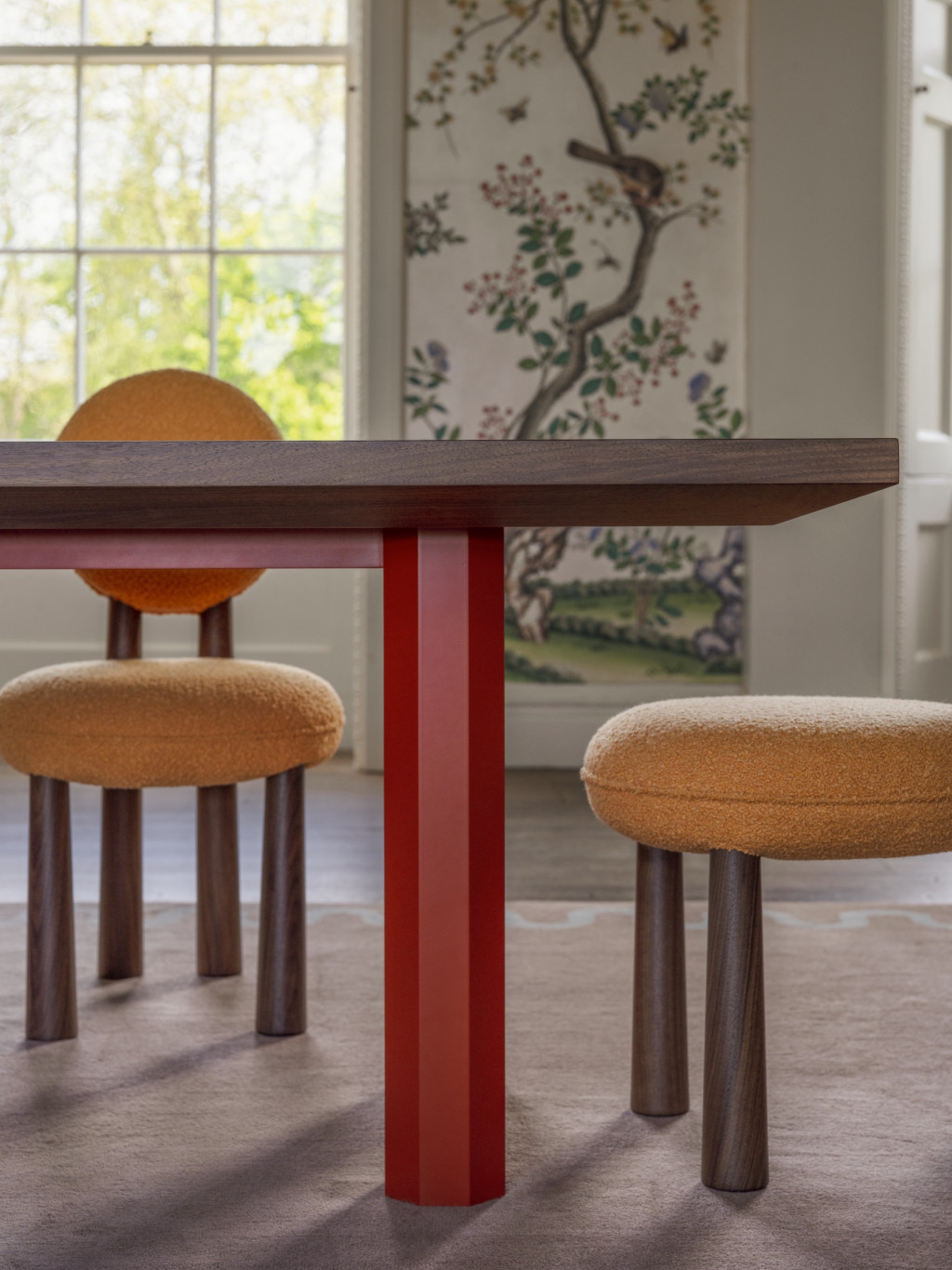 WALNUT DINING TABLE WITH BRASS INLAY VEGETABLES AND MOTHER-OF-PEARL MUSHROOMS.