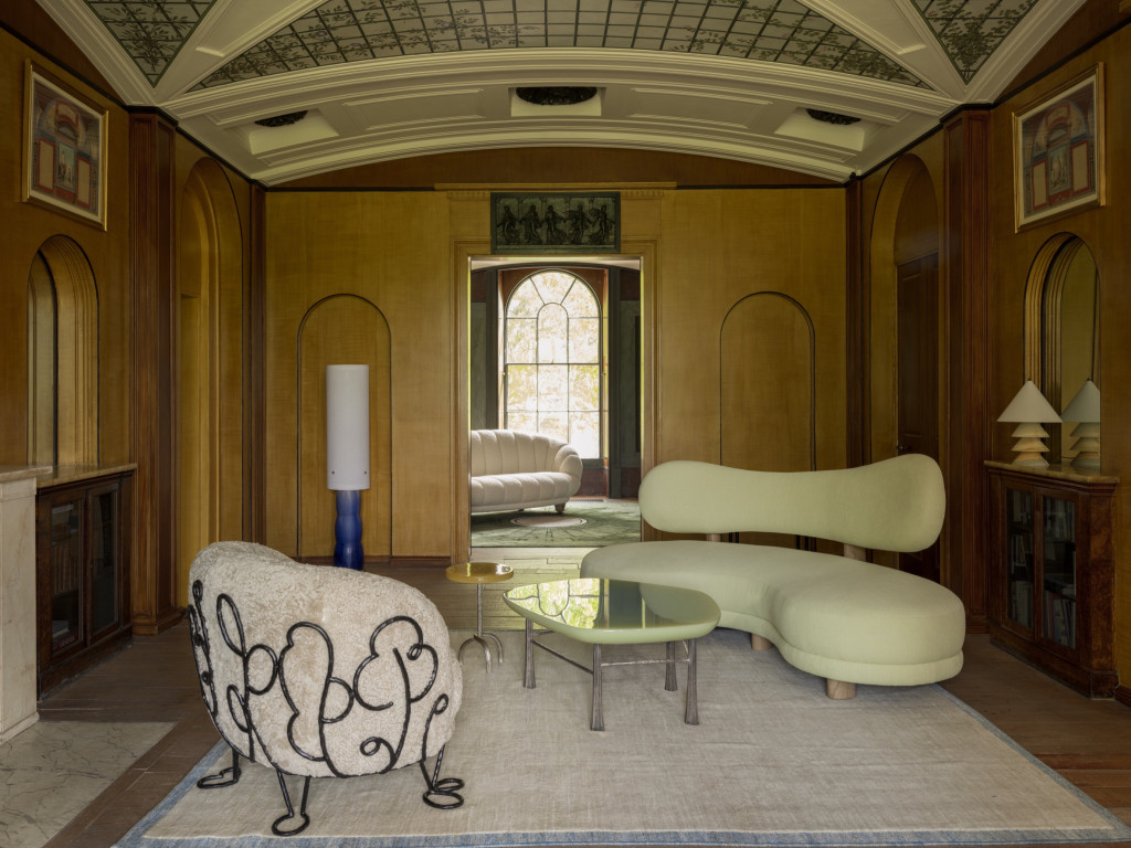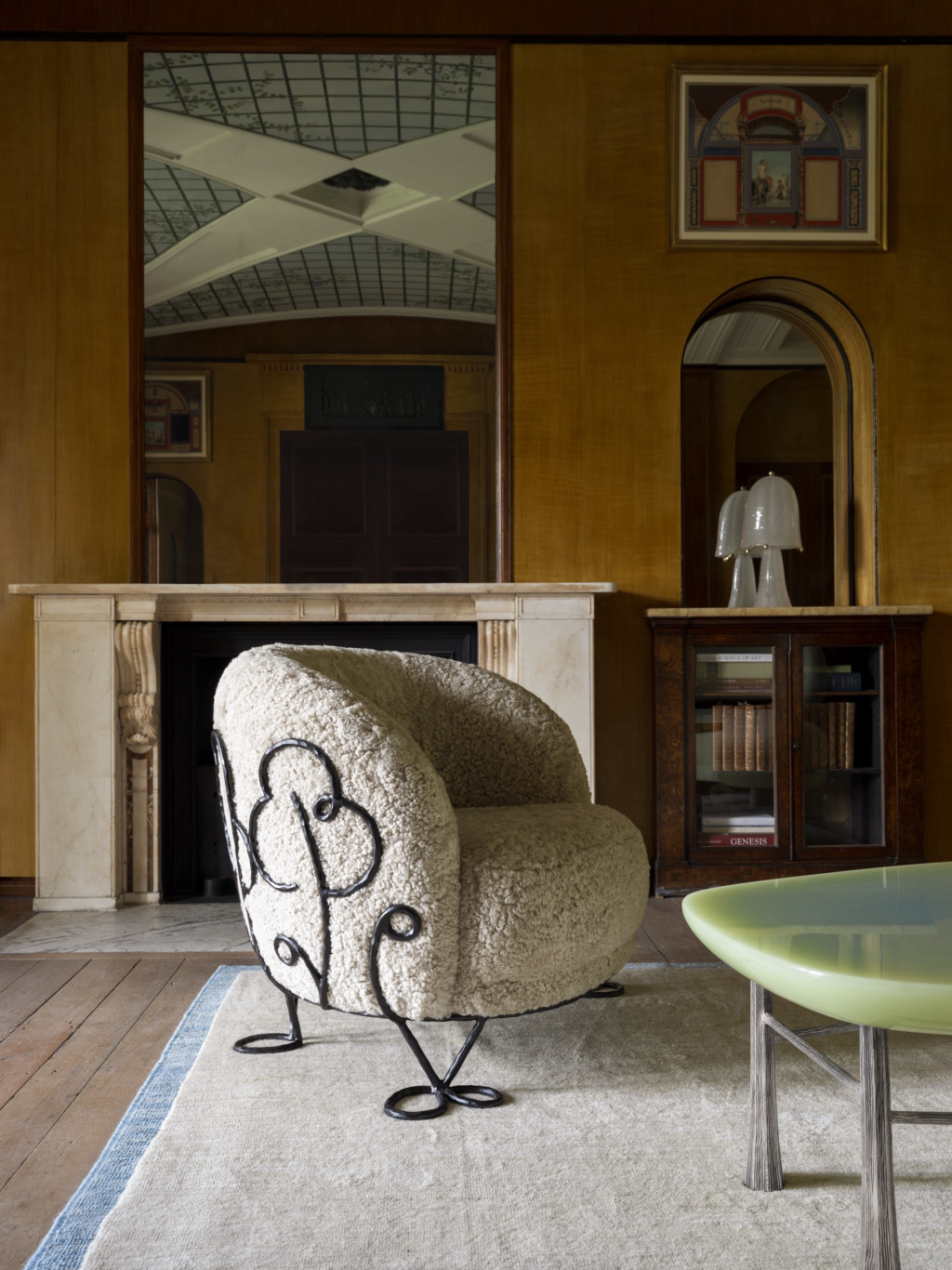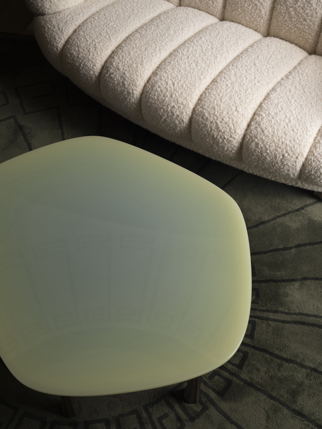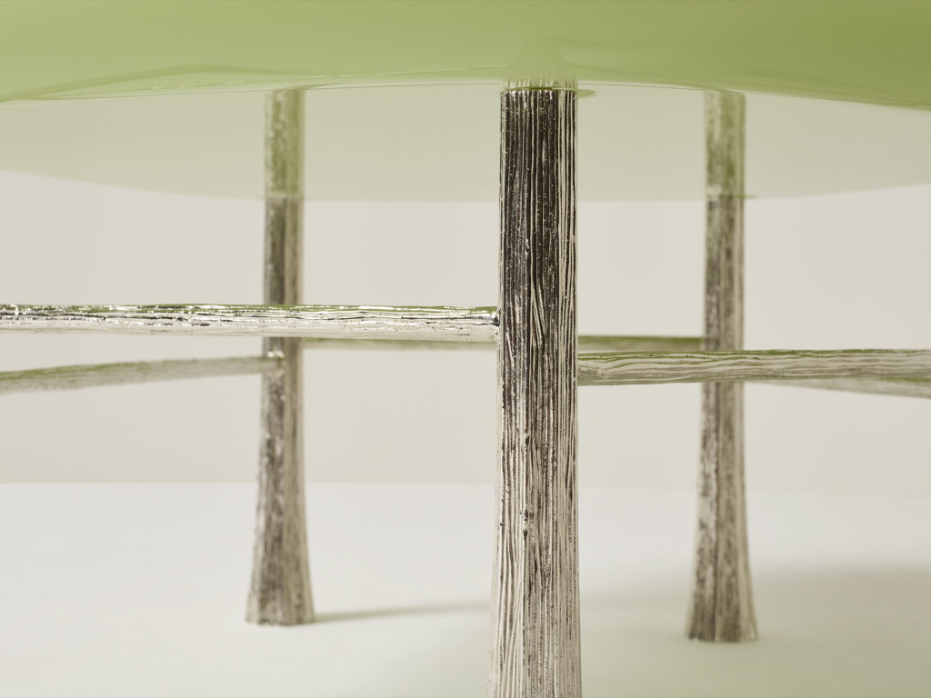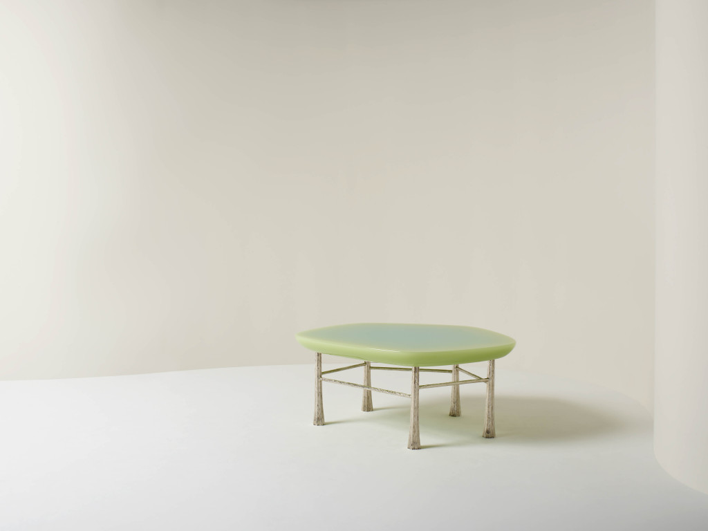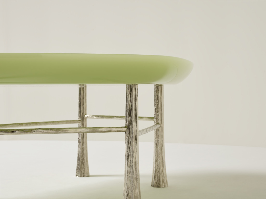 COFFEE TABLE MADE WITH NICKEL-PLATED BRONZE CAST LEGS AND A RESIN TABLETOP.