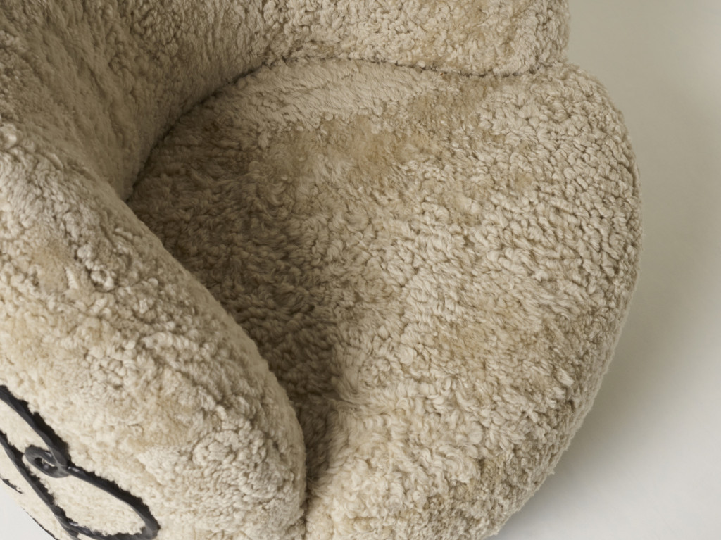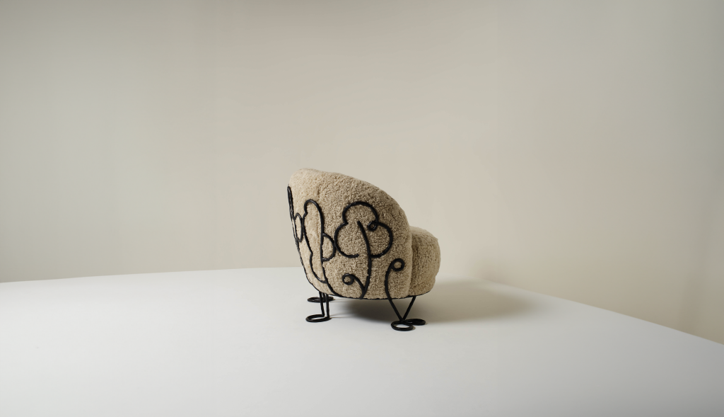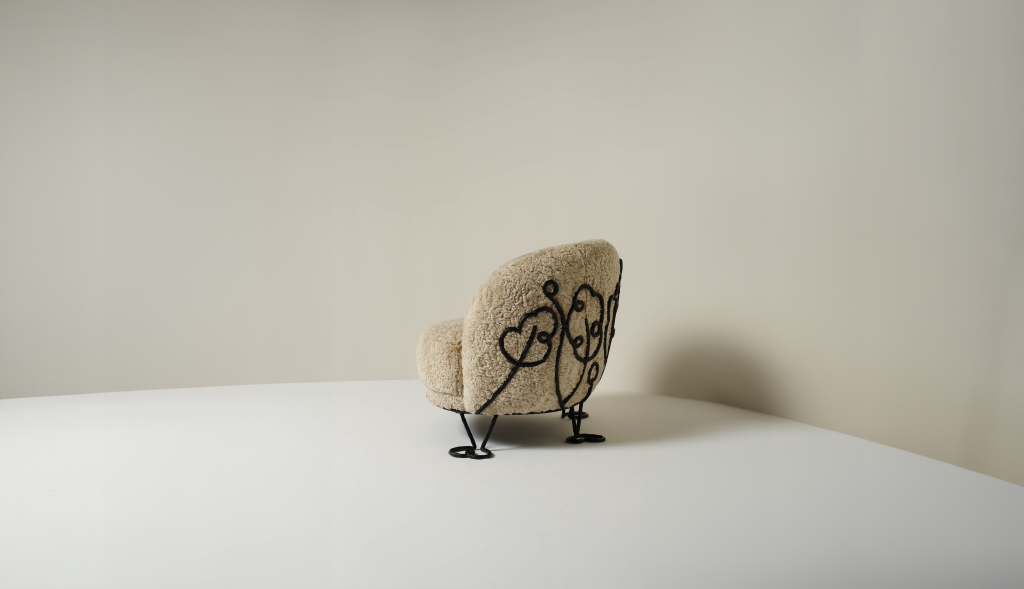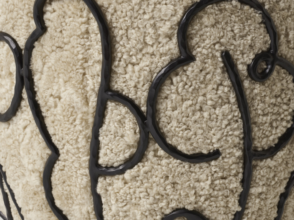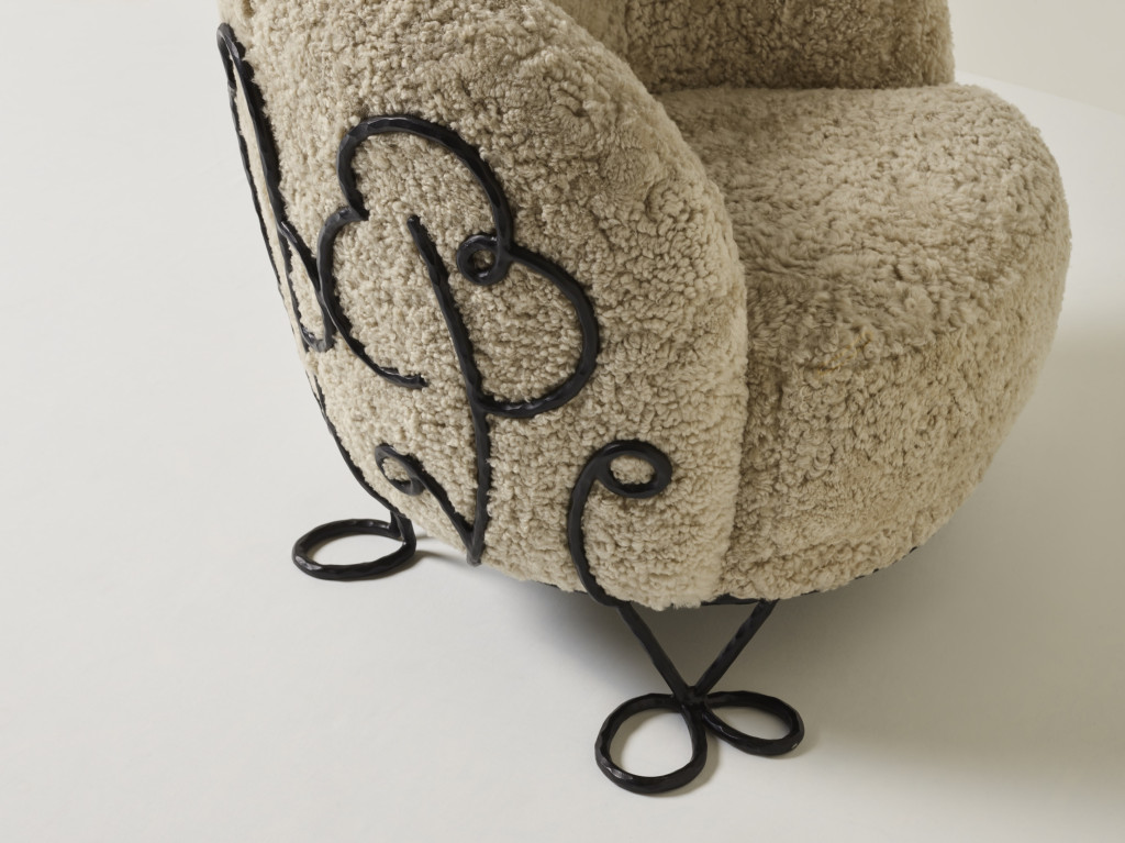 HAND-FORGED STEEL ARMCHAIR FRAME WITH AN UPHOLSTERED SEAT.