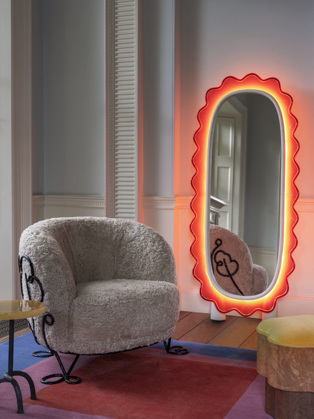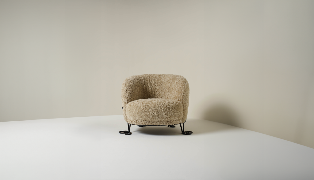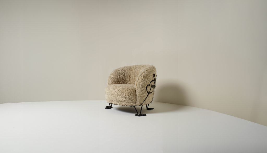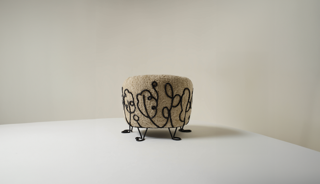 HAND-FORGED STEEL ARMCHAIR FRAME WITH AN UPHOLSTERED SEAT.