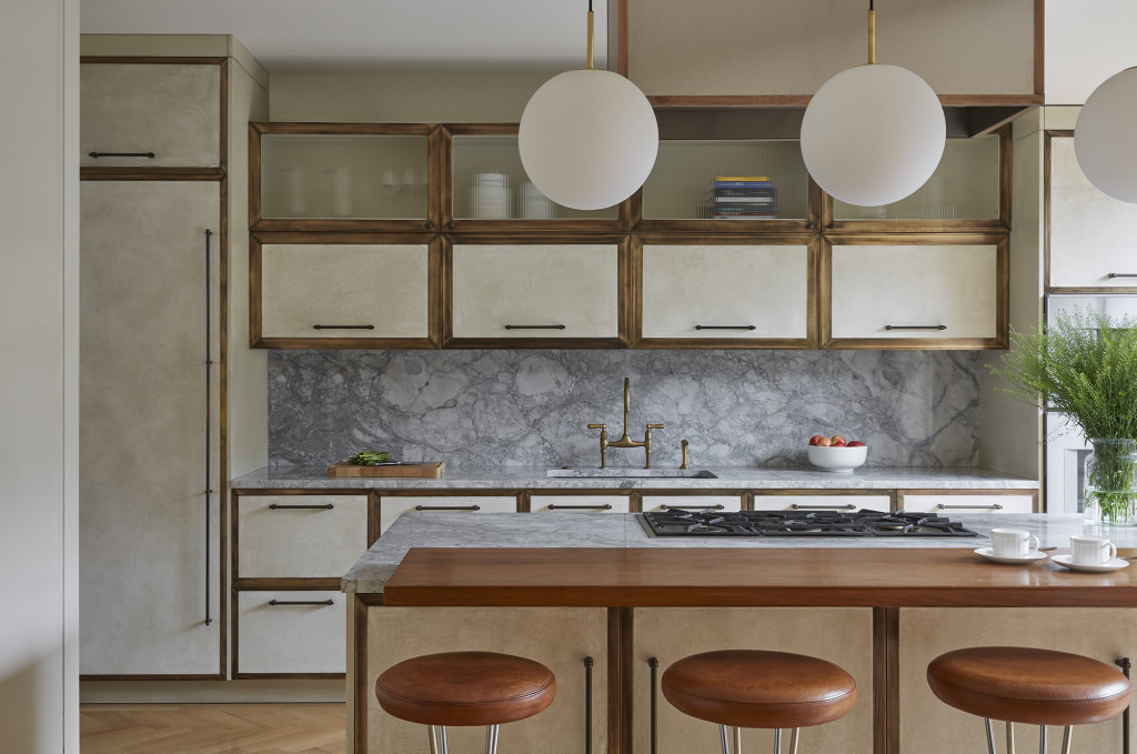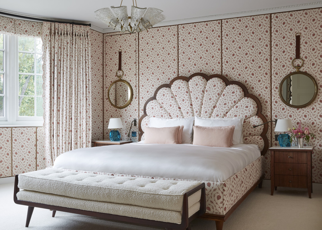 The flow of the house was carefully plotted to maximise light throughout. On the ground floor, crittal doors in the kitchen open onto a lush walled garden, allowing sunlight to illuminate a set of Josef Frank for Svenskt Tenn dining chairs upholstered in his iconic verdant fabrics. Outstanding examples of rare lighting fixtures include a vintage 1940s industrial pendant, an antique Carlo Scarpa glass pendant and an important Fontana Arte, Max Ingrand chandelier.