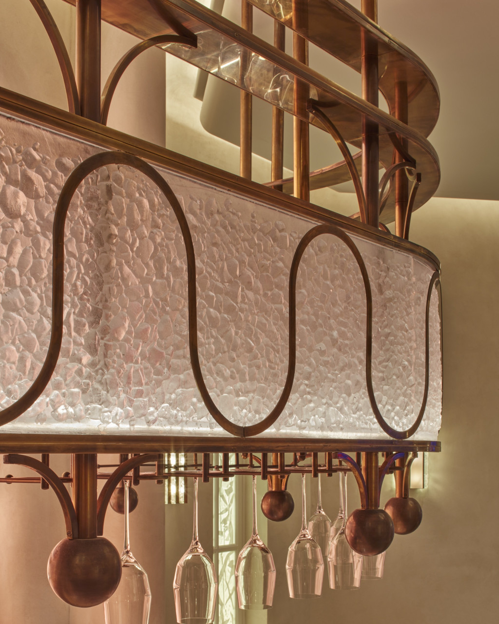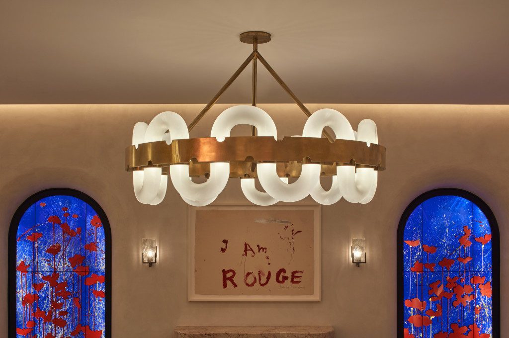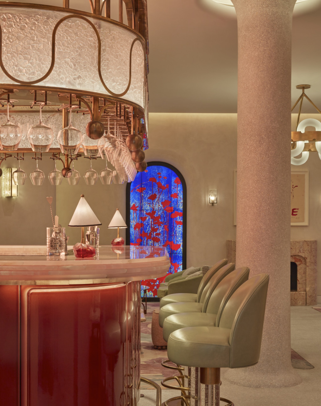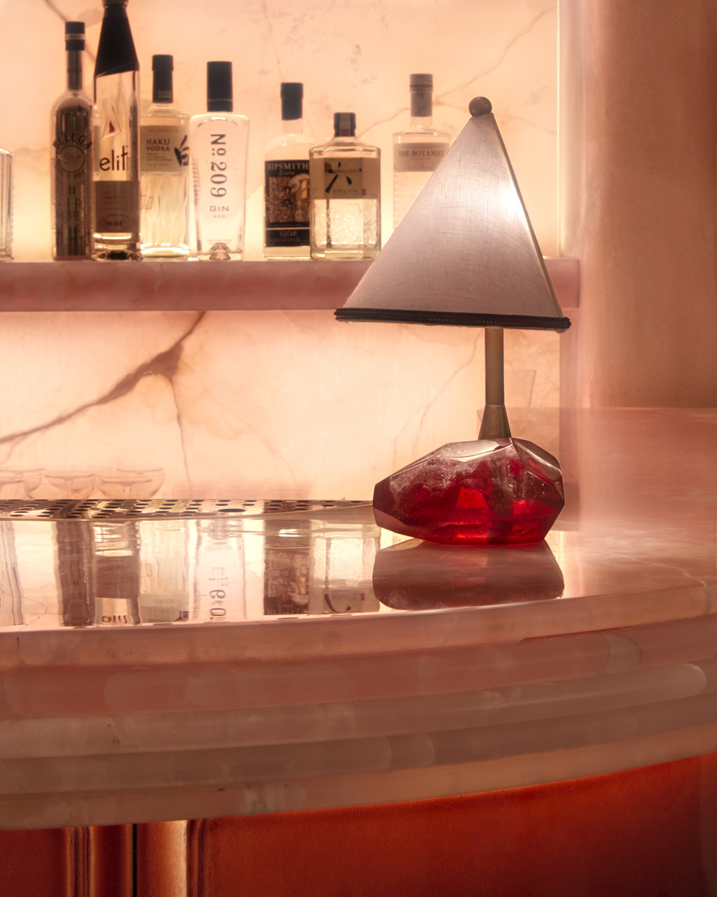 The main area is dominated by two vast stained-glass windows in vivid reds and blues by London-based Bryan Clark, with a large circular pendant overhead. Front of bar is moulded high shine ceramic panels in oxblood with pink onyx bar top and back bar which is backlit. Directly in front are custom stools, each with a sparkling crystal stem.