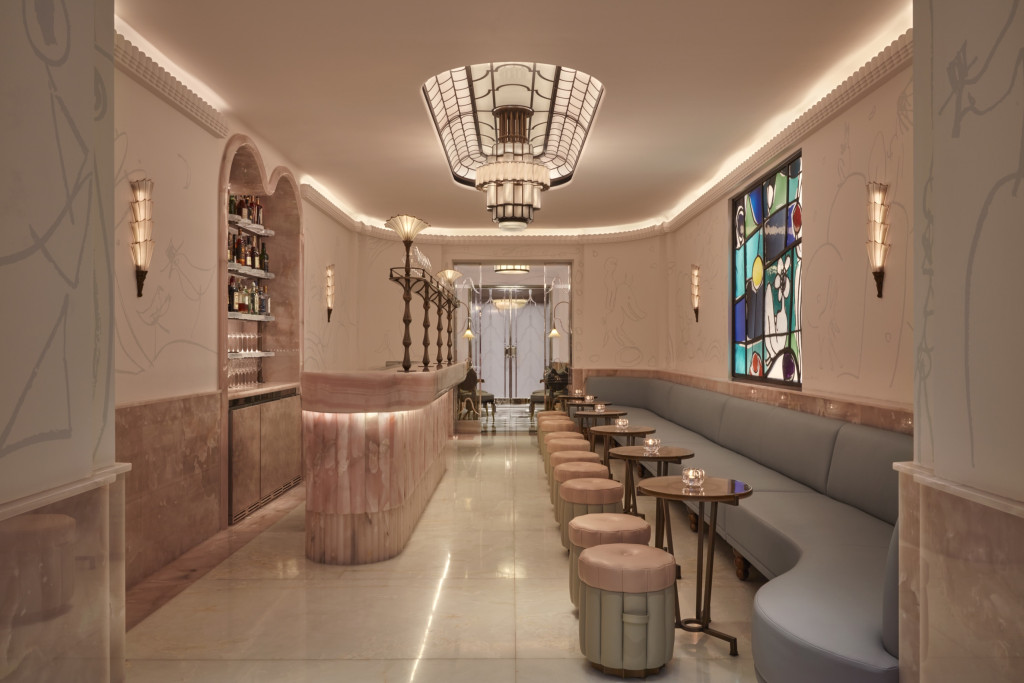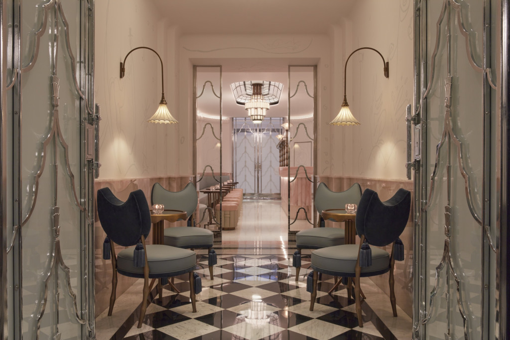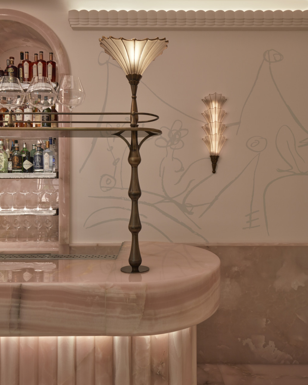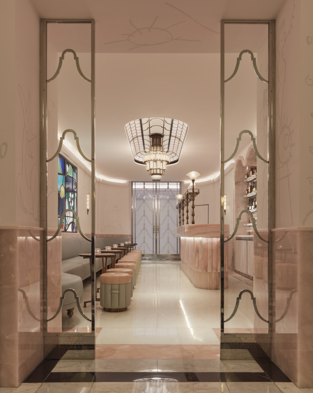 Claridge’s has a very rich history which the studio referenced throughout in the detailing, from the central skylight to the scalloped ceiling. As the space is relatively small, we focussed on an uplifting palette of soft shades. The pink fluted marble bar takes centre stage, flanked by green onyx panels on the walls.