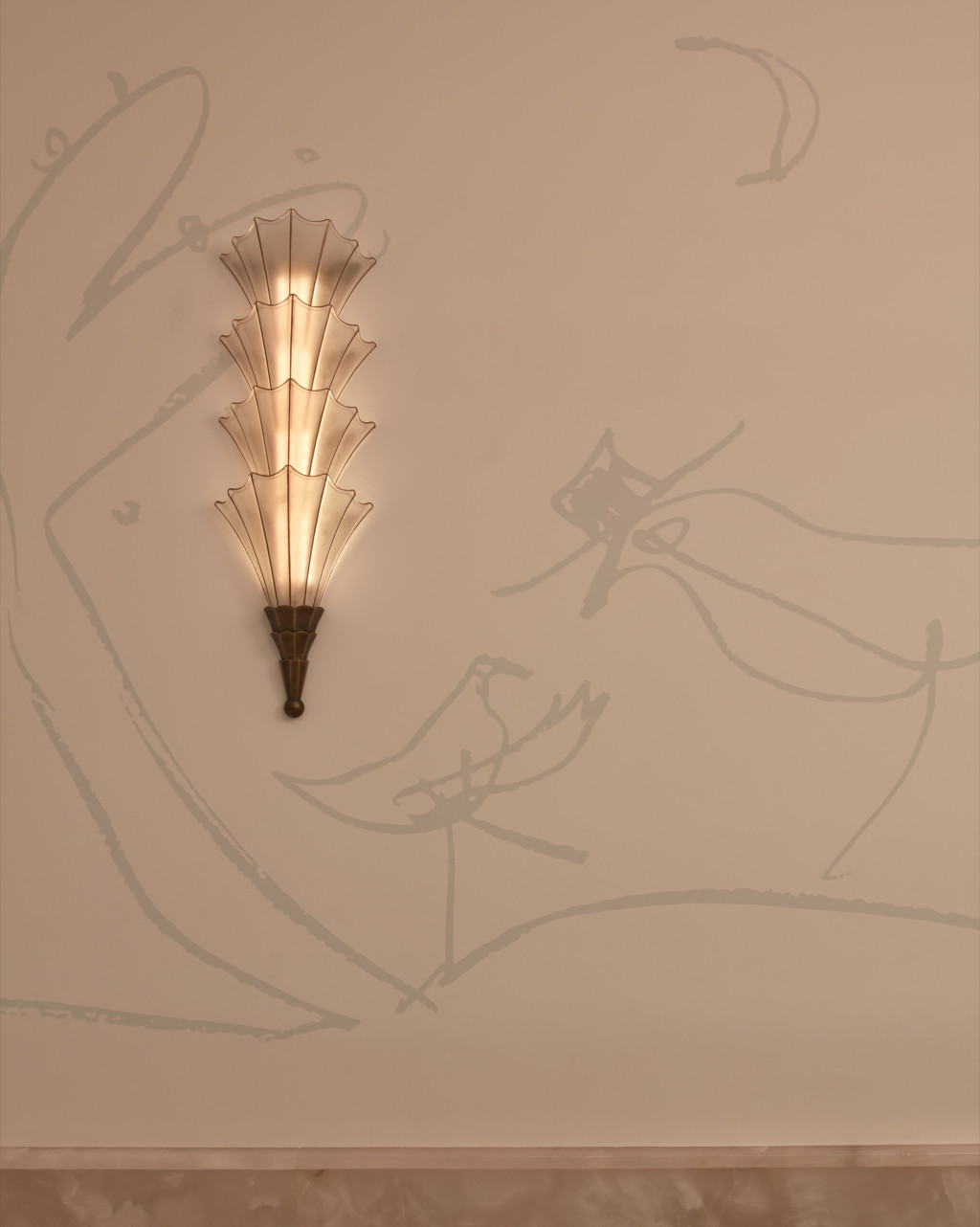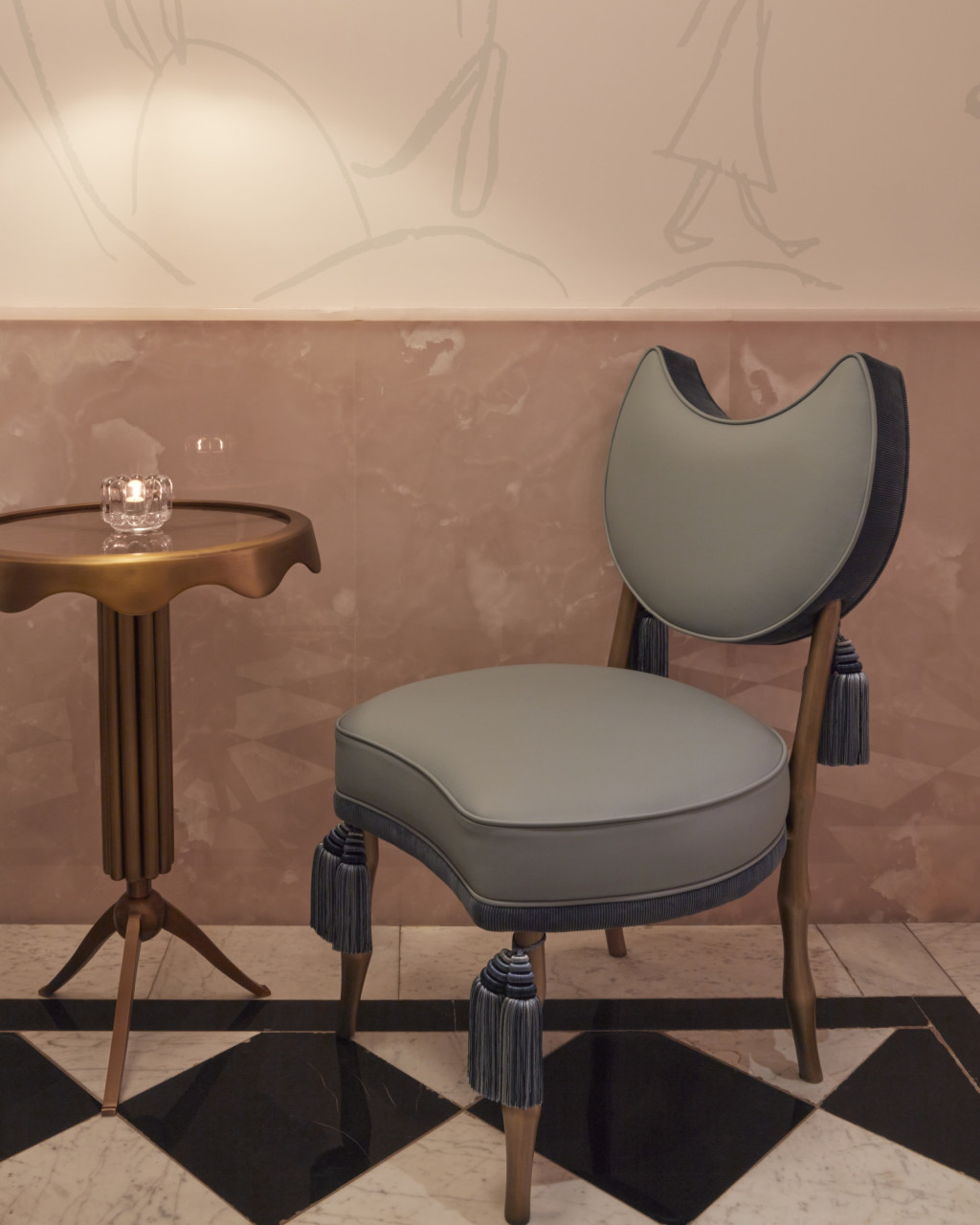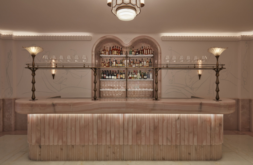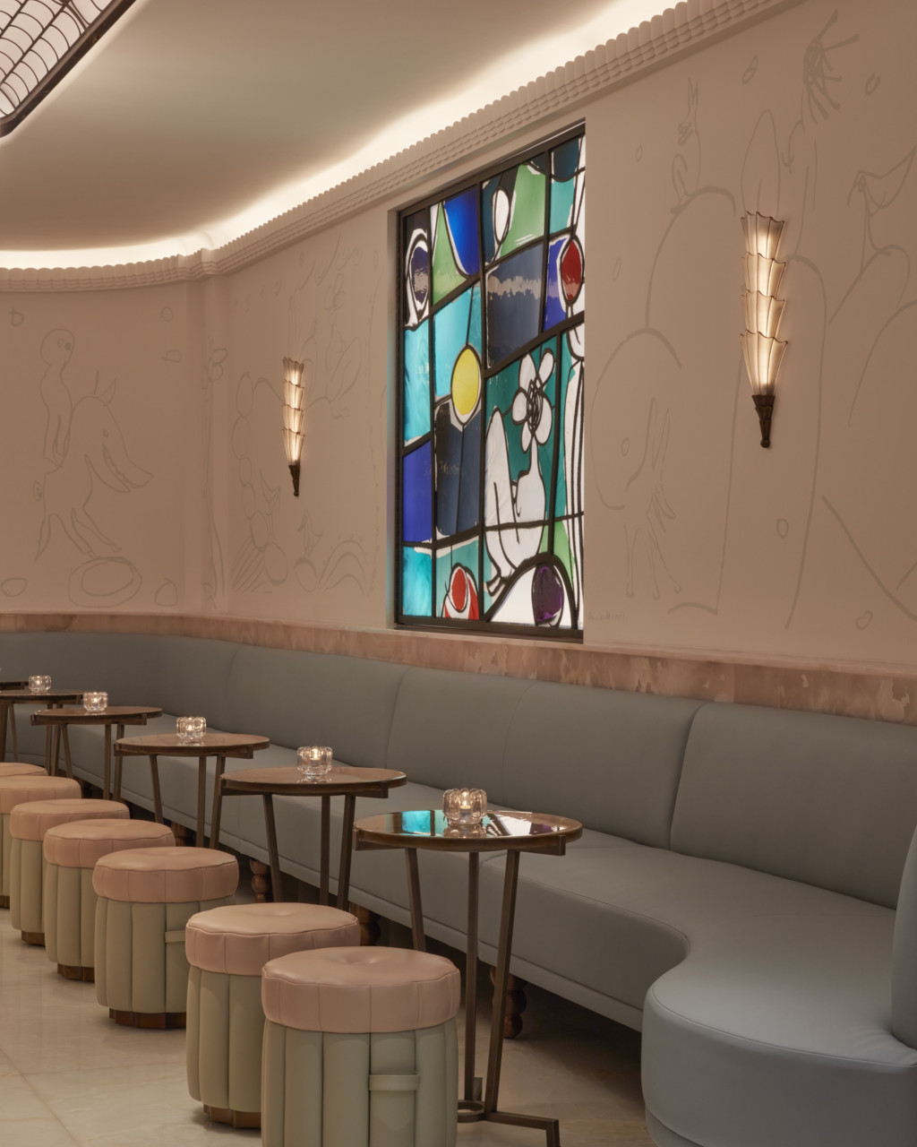 Claridge’s has a very rich history which the studio referenced throughout in the detailing, from the central skylight to the scalloped ceiling. As the space is relatively small, we focussed on an uplifting palette of soft shades. The pink fluted marble bar takes centre stage, flanked by green onyx panels on the walls.