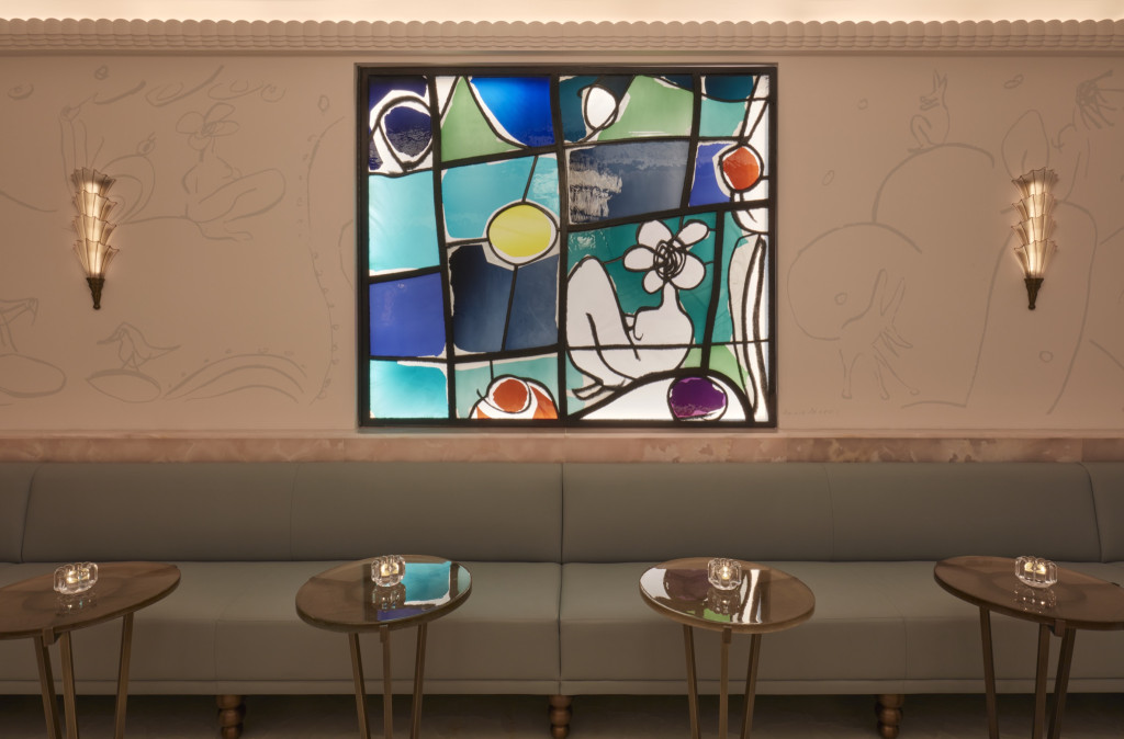We extensively researched the hotel and found that the room was at one stage decorated in beautiful murals. We commissioned the artist Annie Morris to cap off the space with a mural that nods back to the hotel’s heritage yet brings it straight into the 21st century. Annie Morris also created the striking stained glass window opposite the pink onyx bar.